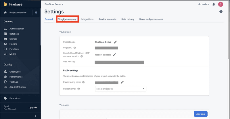 Step 1: Install Cloud Messaging to enable push notifications on iOS. Click Cloud Messaging as shown: